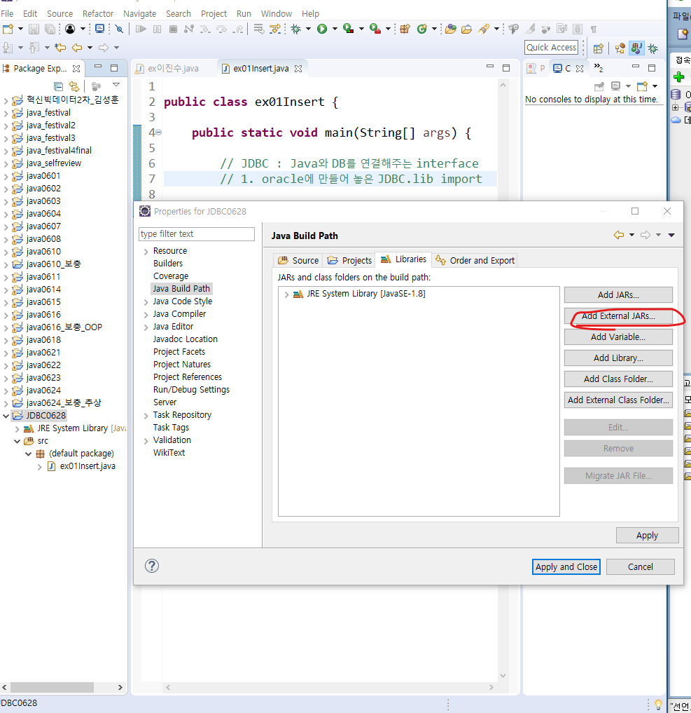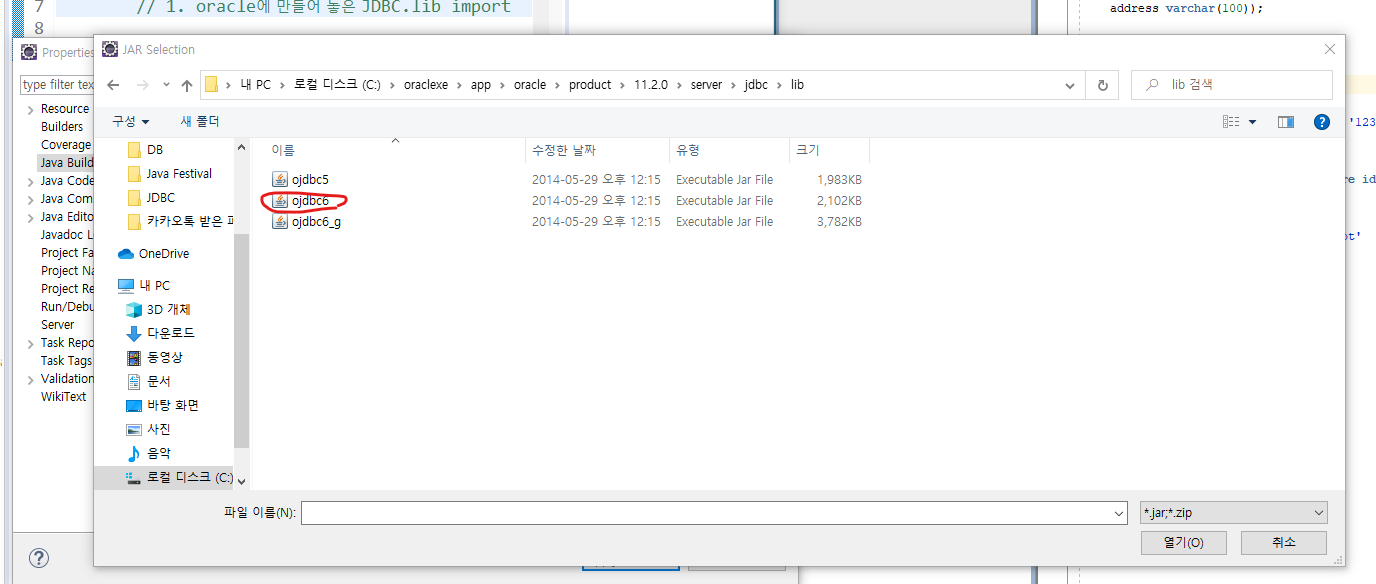 properties -> Java Build Path -> Add External JARs -> ojdbc.jar 파일 열기