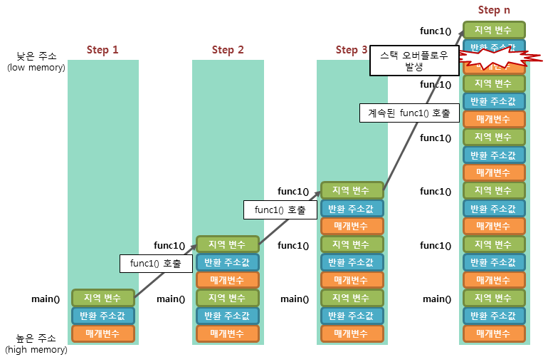 따라서 C언어에서는 실행 중인 프로그램에서 스택 오버플로우가 발생하면, 에러를 발생하고 곧바로 강제 종료시킵니다.